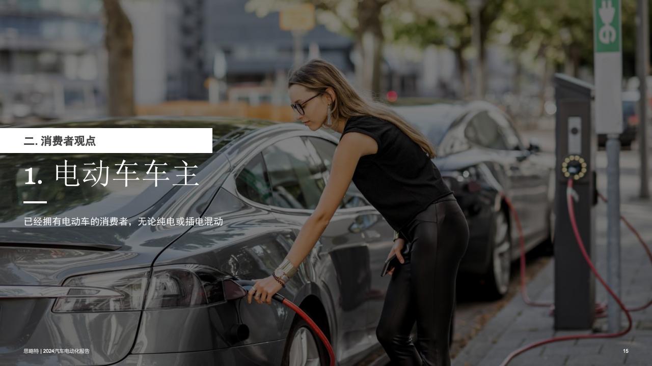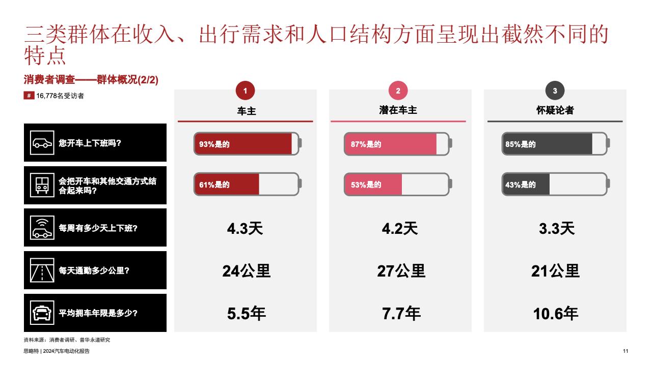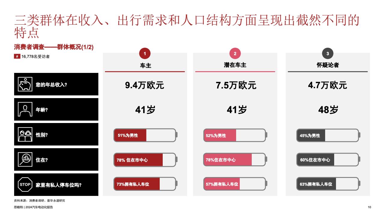 5-7%的受訪者為電動車車主,在年齡、收入和居住地點等方面與潛在車主、懷疑論者存在差異。車主通常是年輕、高收入的男性,擁有私人停車設(shè)施。