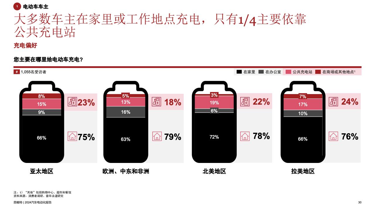 私人停車設(shè)施和充電解決方案對車主來說至關(guān)重要,因為65%的車主主要依靠私人解決方案為車輛充電。在澳大利亞(88%)和印度尼西亞(72%)等國家, 由于公共充電基礎(chǔ)設(shè)施建設(shè)仍處于早期階段,車主對私人充電解決方案的依賴程度甚至更高。