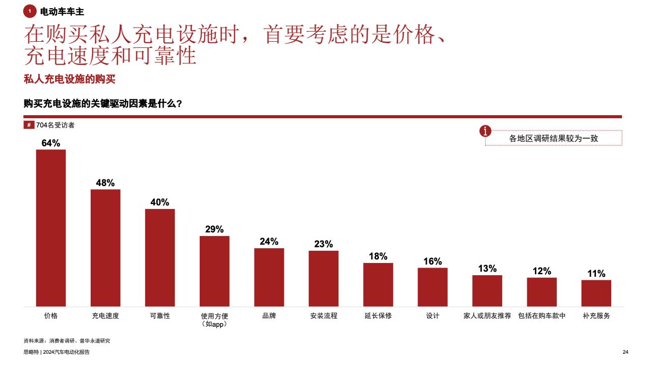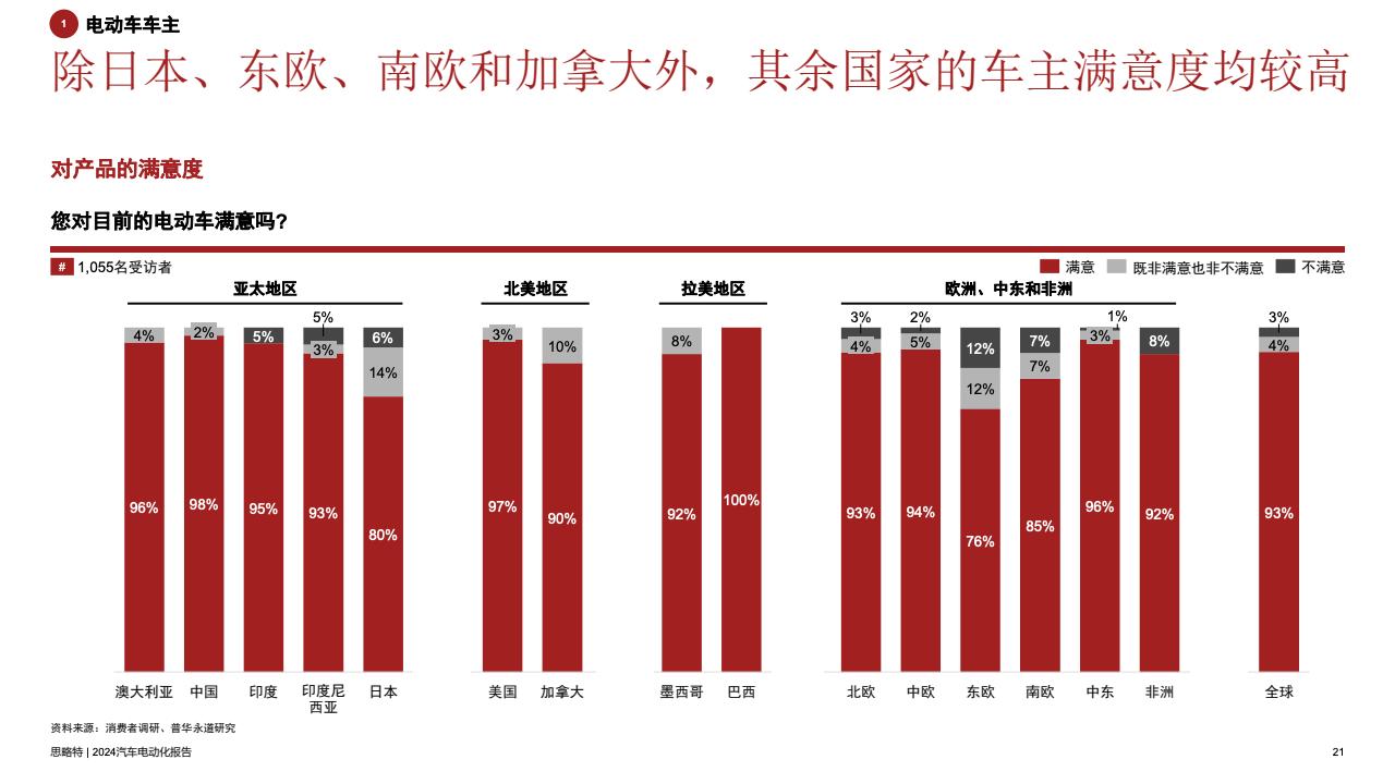 目前車主的整體滿意度很高,約93%對自己的汽車表示滿意。較高滿意度的主要原因在各個地區(qū)較為一致,包括充電時間符合預(yù)期(也考慮到在家過夜充電的可能性)、駕駛體驗和較低的運營成本。地區(qū)差異方面,歐洲更看重電動車較低的運營成本,北美和中東則更看重充電速度。