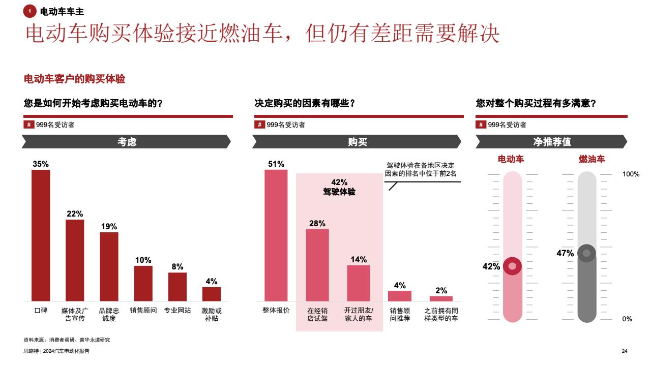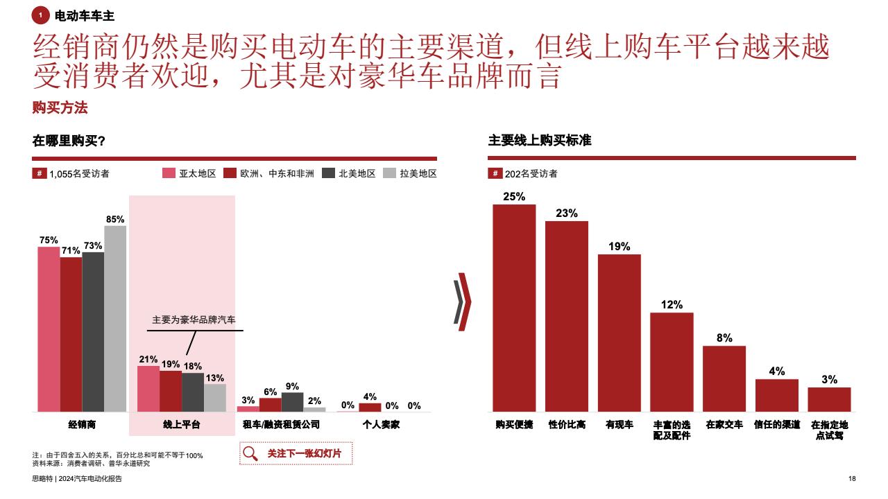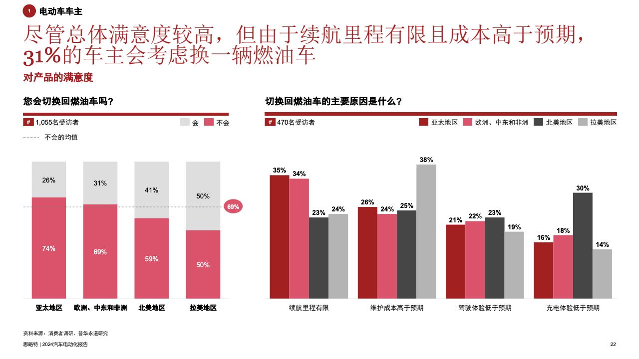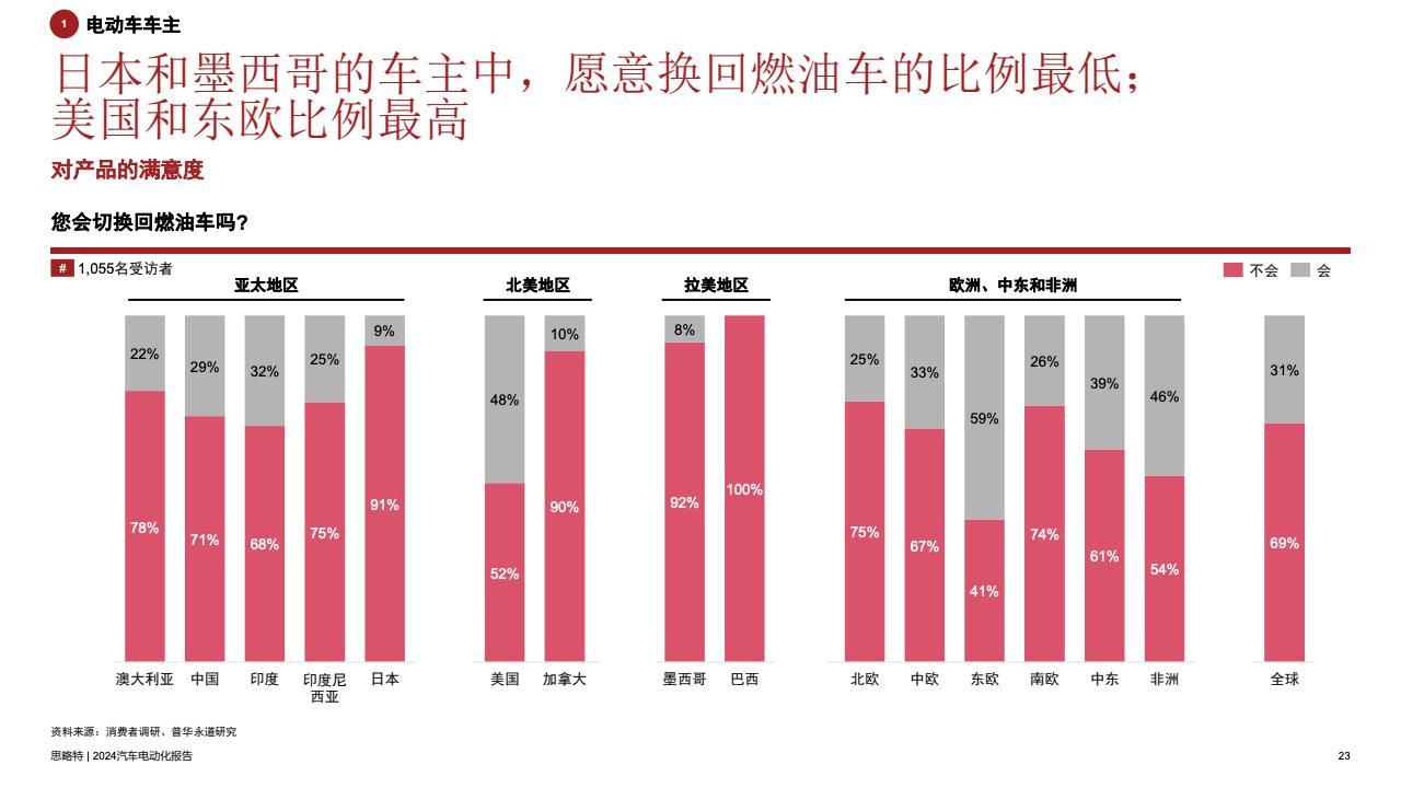 在對電動車的忠誠度方面,超過2/3的車主不會換回燃油車;仍有1/3考慮會換回燃油車,因為他們想要更長的行駛里程,尤其是在澳大利亞和中東等國家。這些國家的行駛距離更遠,或天氣條件會影響到行駛里程。